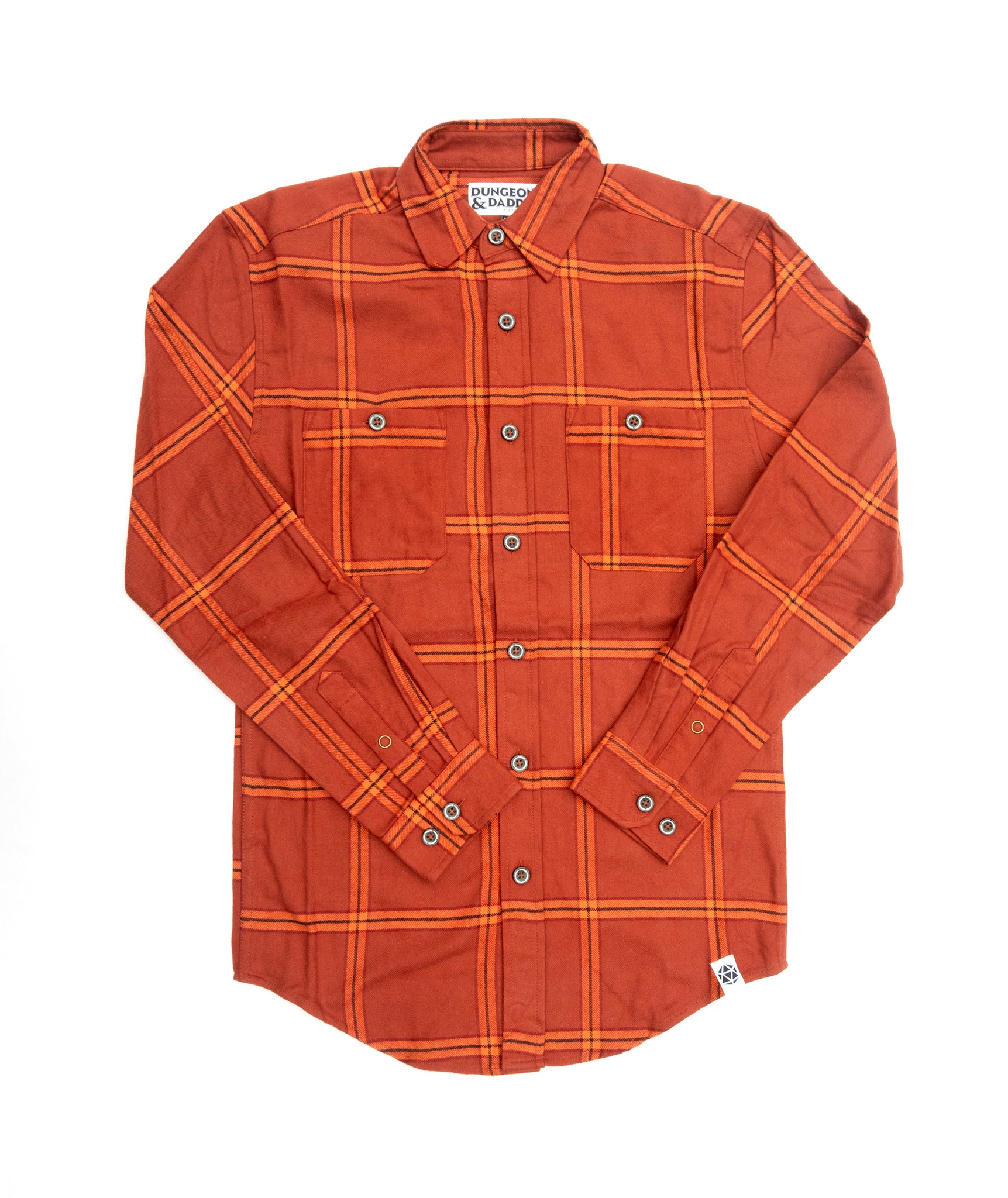 This is a 100% BCI cotton, unisex, classic button-down flannel shirt, with discrete Dungeons and Daddies themed buttons and D20 tag. Runs small, size up 1-2 sizes for roomier fit.